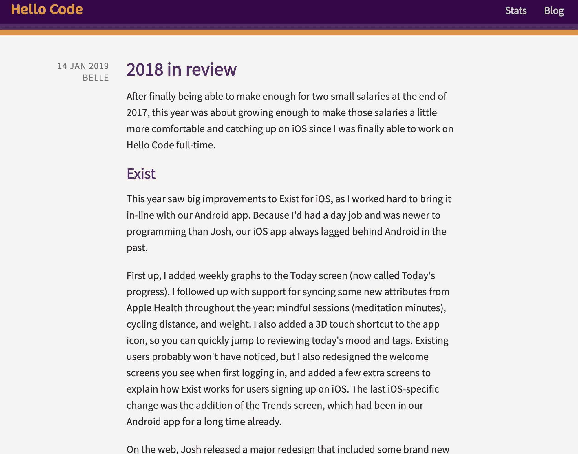 嗨,我是 Belle 。我是一名 iOS 开发工程师,是一家叫 Hello Code 的独立软件公司的联合创始人。我们总部在澳大利亚的墨尔本,只有我和我的联合创始人 Josh 。我们主要的 app 叫 Exist ,这是个有网页版、 iOS 版、Android 版的 SaaS 产品。