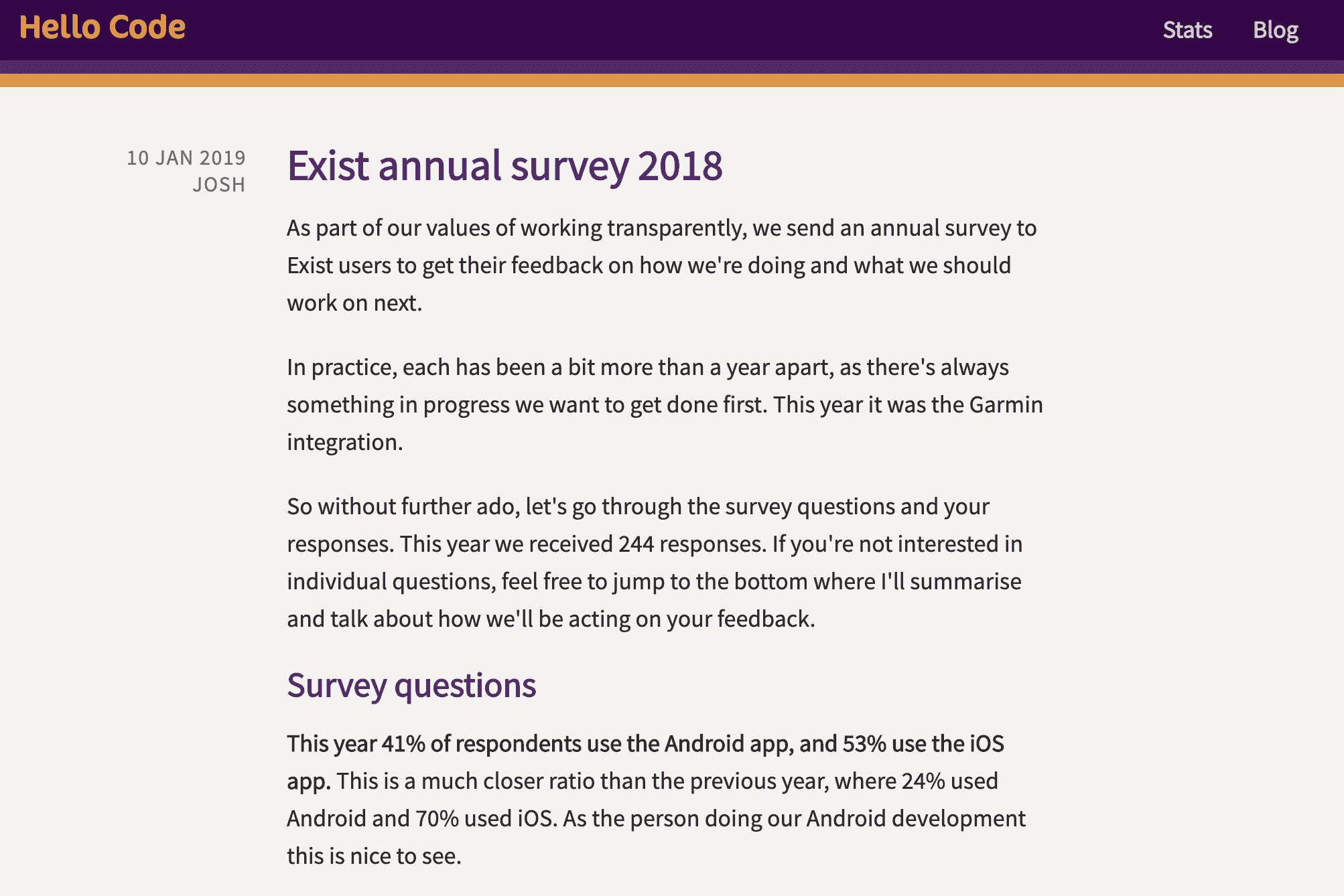 为了更深入了解用户对 Exist 的使用情况,以及他们希望 Exist 在未来如何改进,我们每年都会向所有的用户发送一份调查报告。然后我们会把调查结果写在博客上,包括我们未来一年的计划,这些都受调查结果的影响。这个是我们 2018 年调查结果的博文,详细介绍了我们 2018 年的调查结果。