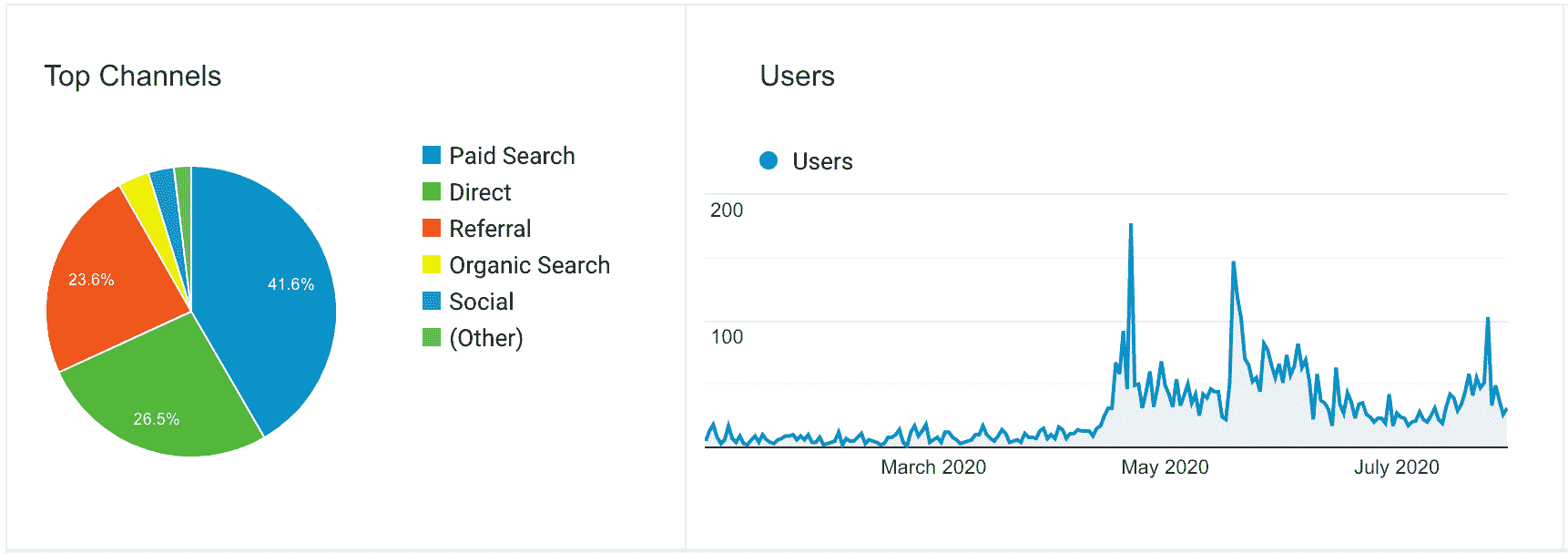 如果看谷歌分析报告,你就能看到当我开始在谷歌广告上做广告时用户数量激增。