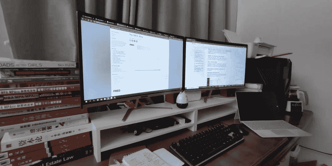 工作台:左边是最近看的经济学类书籍,工作技能书籍,以及考研的资料;一个台式机+两个显示器,不管是学习还是工作,总是需要两个显示器;一台Surface,外出工作神器,配合Google Drive和TeamViewer使用。