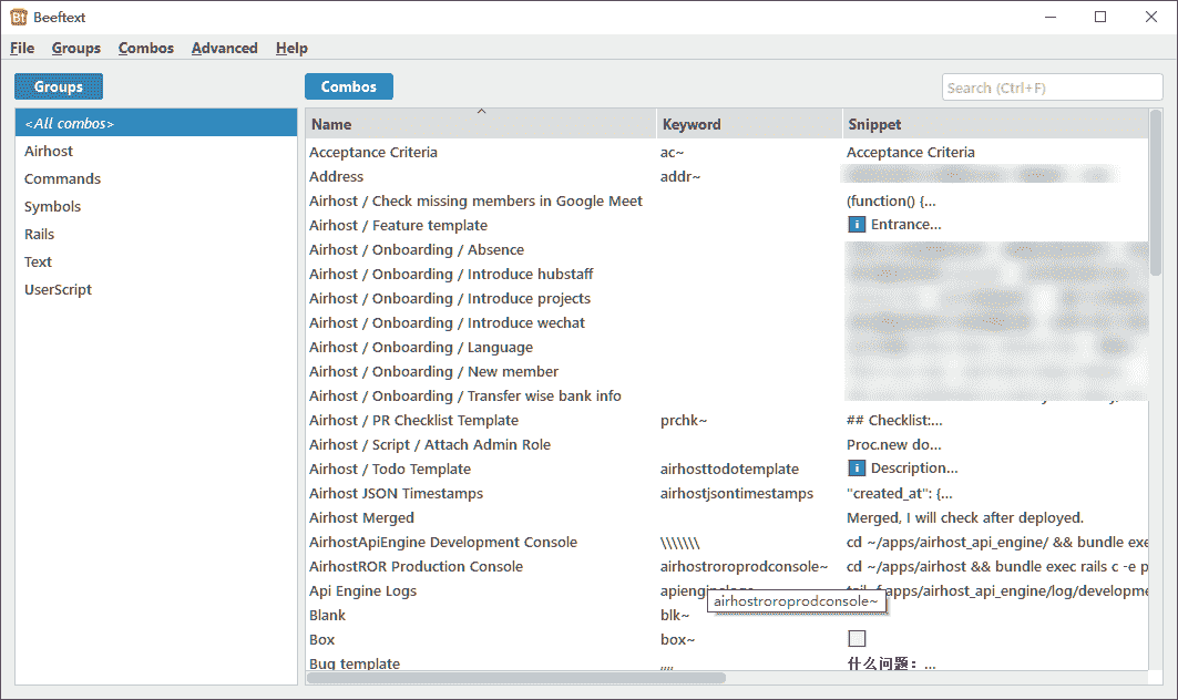 提高效率有一个很重要的事情,就是减少重复,这里我再推荐一个日常使用的 Snippet 管理工具 Beeftext,我把日常的一些重复用语,都做成了可以快速输出的片段。这是 Windows 上的软件,之前使用 macOS 时,类似的软件是 Dash Doc,不过这个应用作者吃相略有些难看,新的大版本上面更新一 堆垃圾功能,所以后面的版本,我都没有续费升级了。