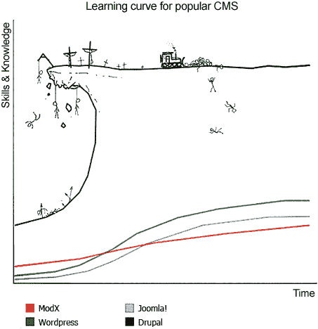兰州的这份新工作是在运营商现场维护加少量开发,这让我有了大把的时间去干其他事情;首要的事情当然是攒钱买婚房了,就想着接点私活增加收入,在摸索了一段时间后,我发现java并不适合我接活,php更适合,还有大量的现成框架,在多方对比后我选择了使用 drupal,并开始投入时间去学习,尝试用她做了几个简单的网站。但学习Drupal确实是有点门槛的,就像之前在Drupal圈广泛流传的一张图(CMS学习曲线对比),虽然有点夸大的成分,但我确实是感同身受: