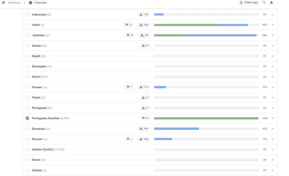 ▲社区贡献者们在 Crowdin 协作将 freeCodeCamp.org 官网的课程翻译为 49 种语言。