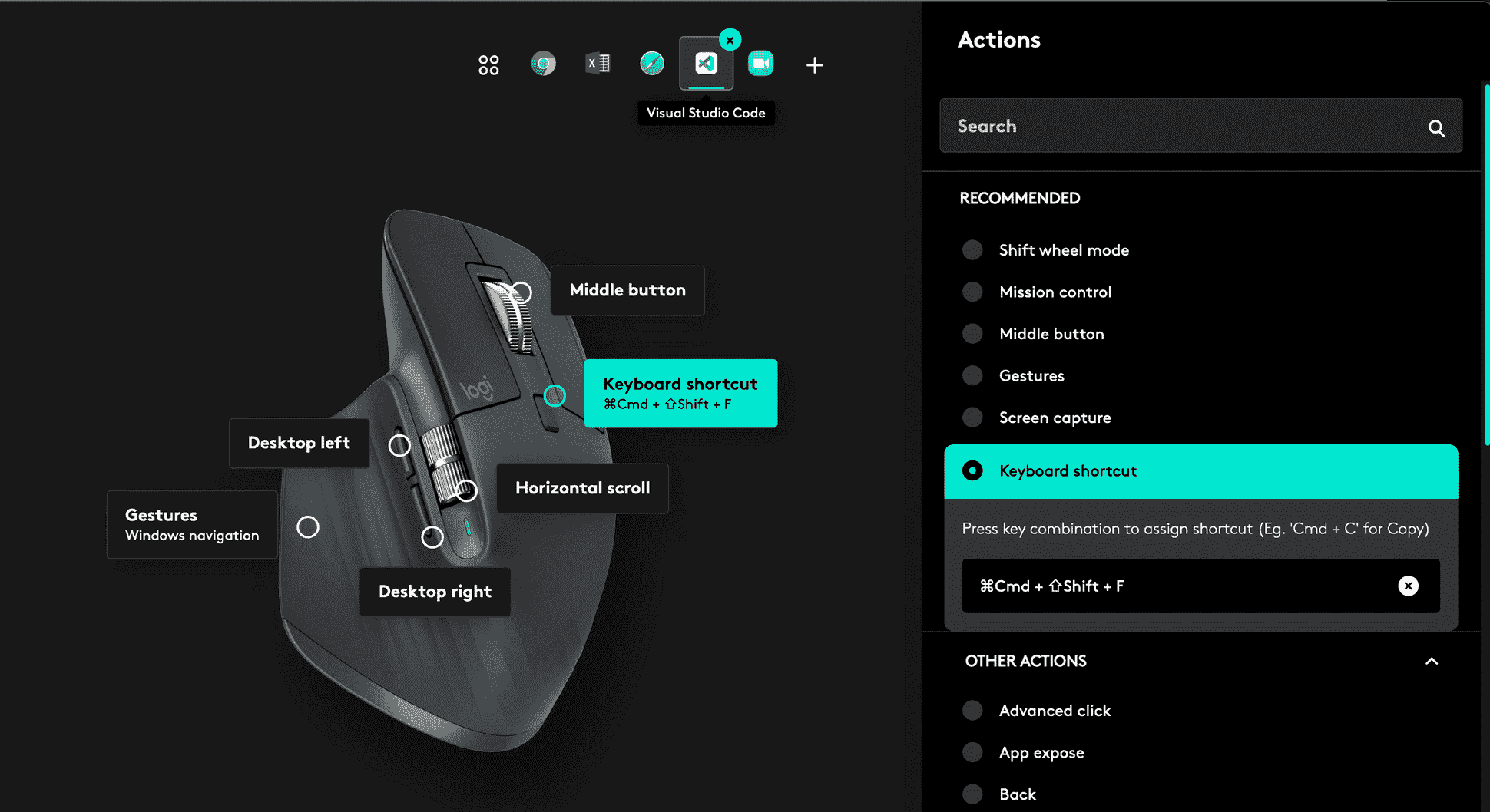 比如一键多个桌面切换,一键打开 Chrome Tab, 还有一键 VScode 里面的快速搜索。虽然是同一个键,但是在不同的 App 上面效果不一样,这样能最大程度的提高工作效率。