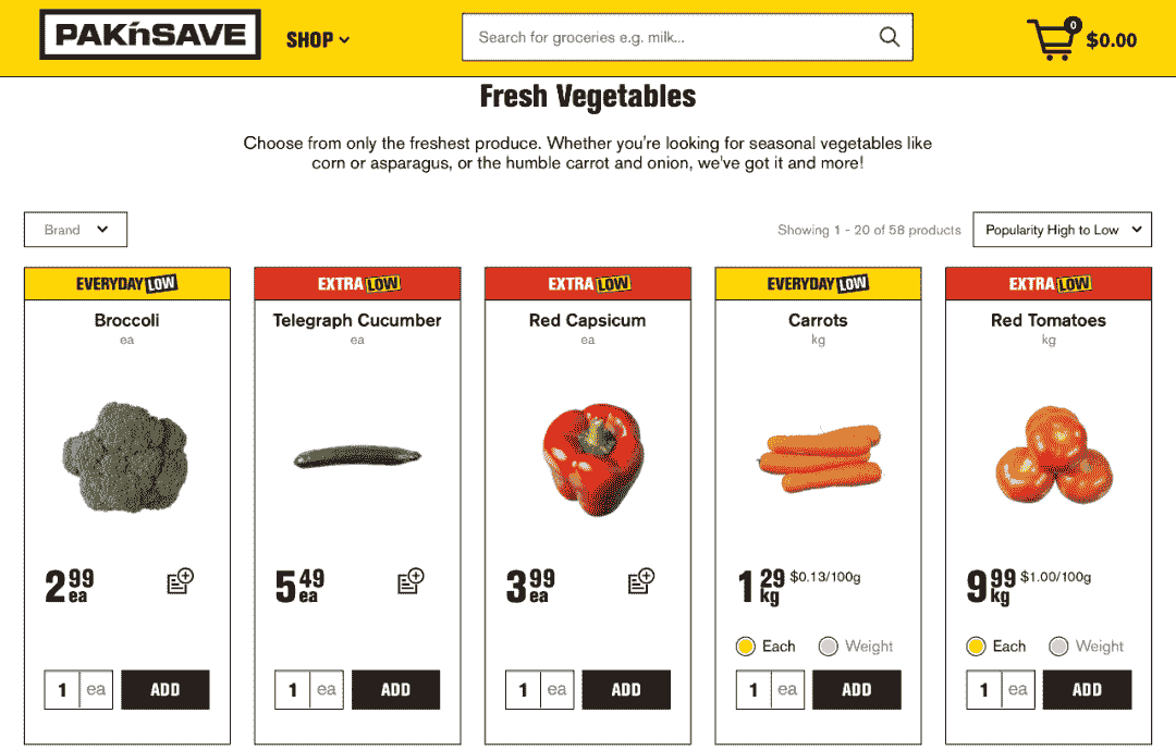 Pak‘n Save 是新西兰价格较为便宜的平价超市,图为冬天的蔬菜价格